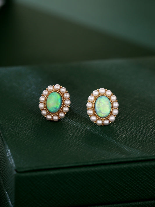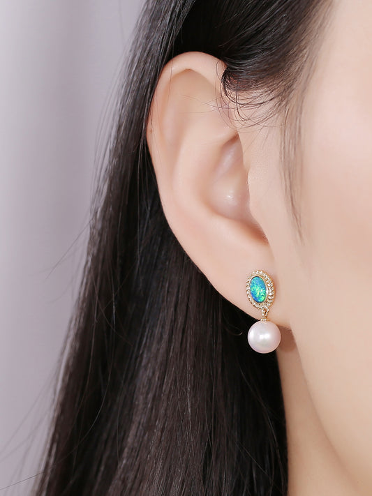 18K Gold Earrings Drop with natural opal and akoya pearl